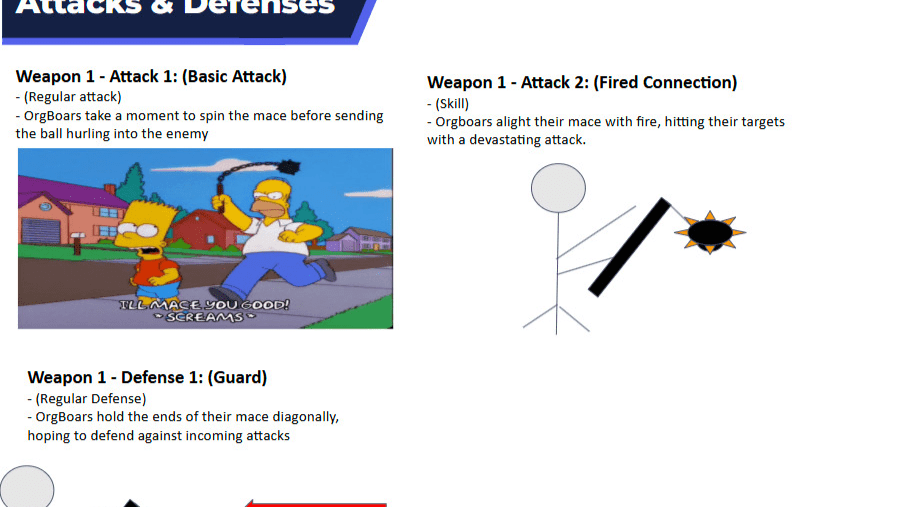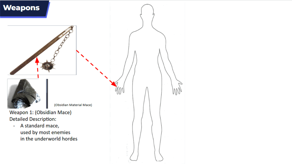- The weapon and attack design strengthen the characteristics of being frightening to the player. The mace is a physical representation of the character, being something that is sharp and dangerous to others when flaying about.
