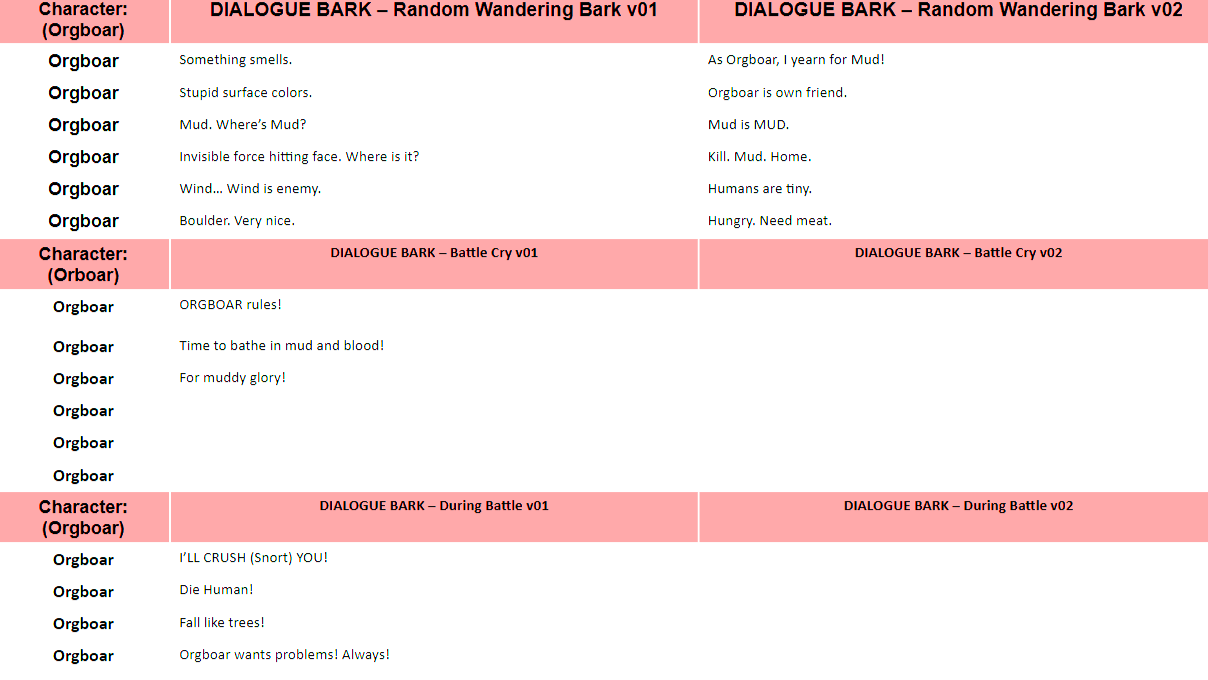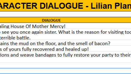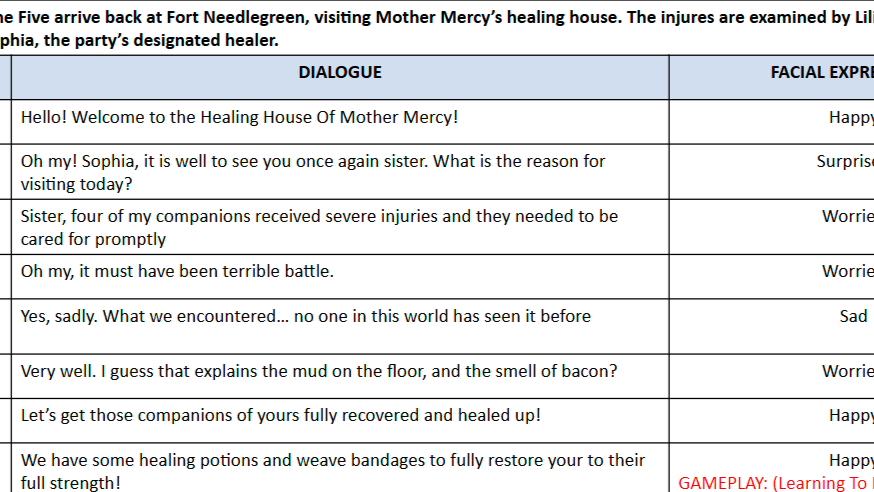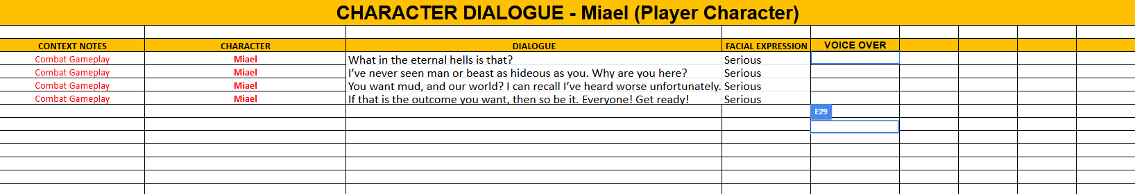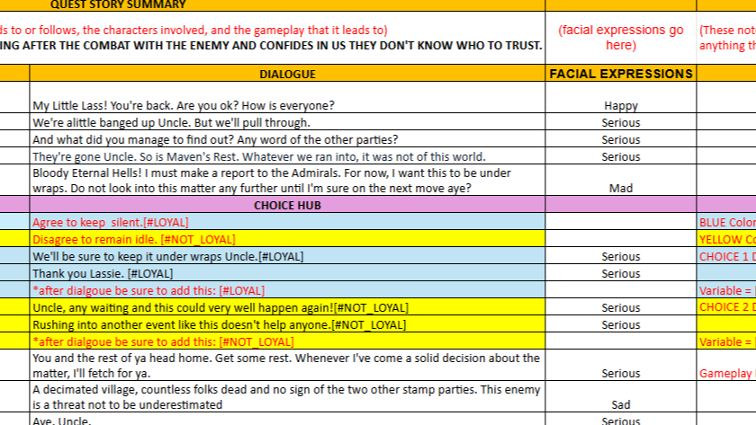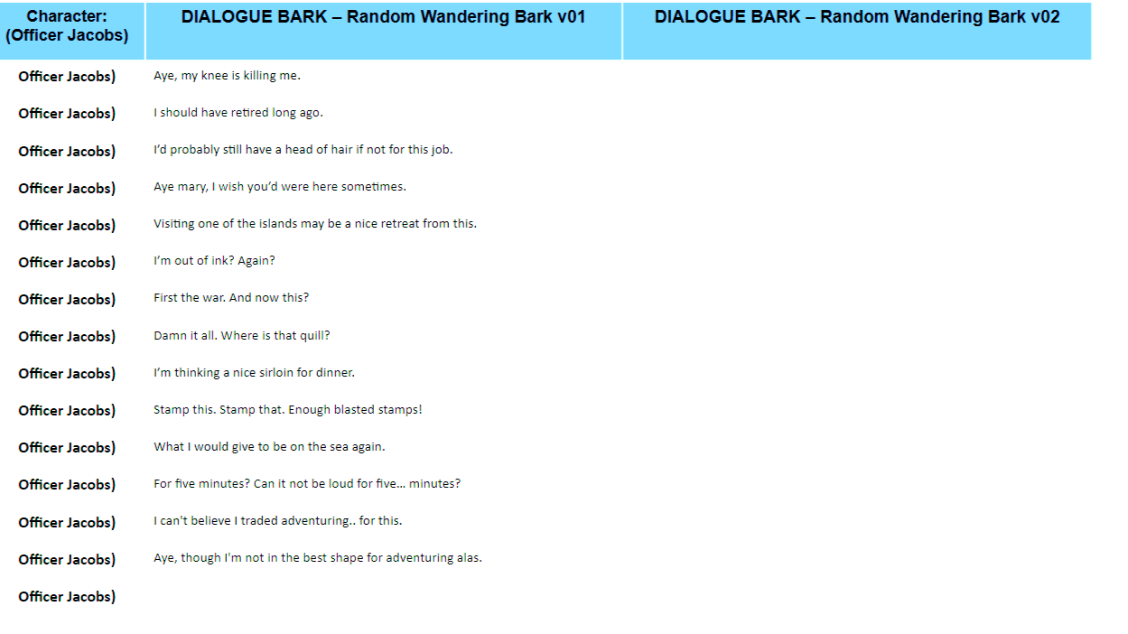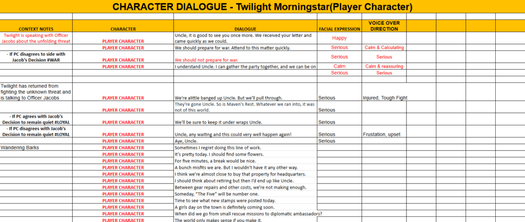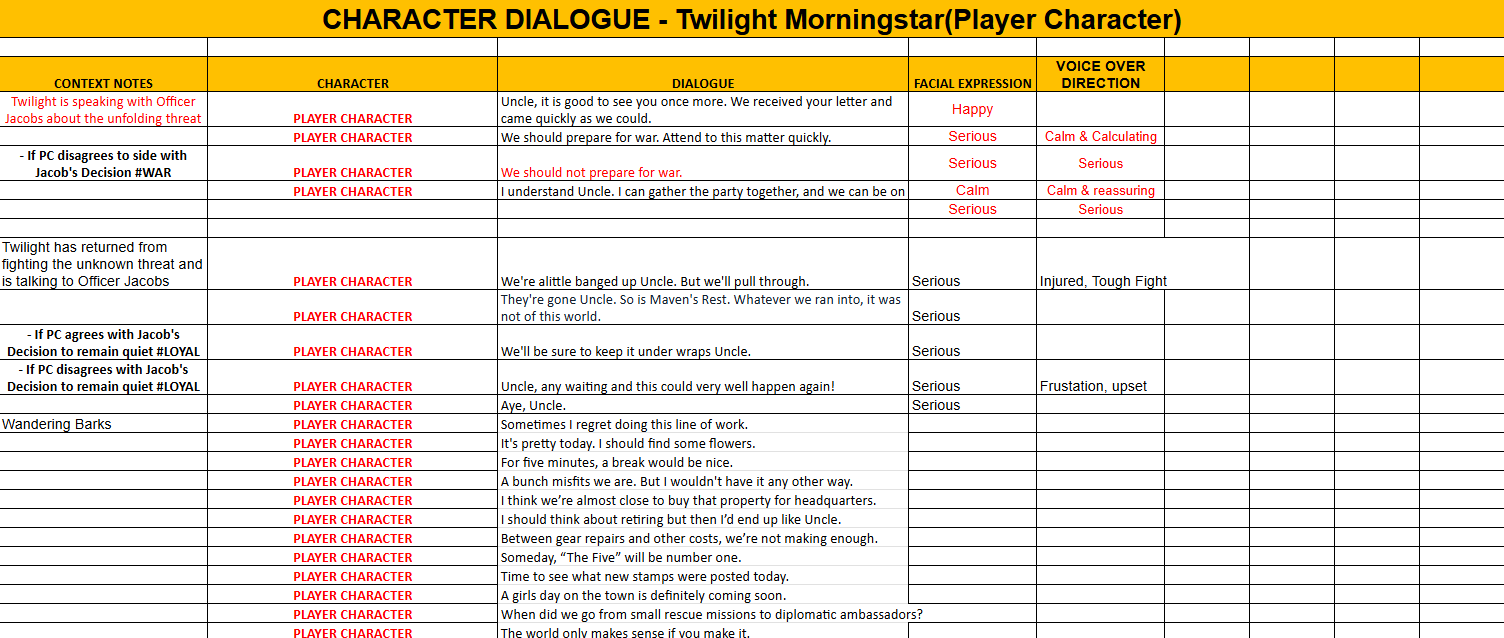 - All lines of dialogue pertaining to each character, along with scene details and quest summarizations, are provided to provide as much detail for the voice actor regarding mood and situational context.