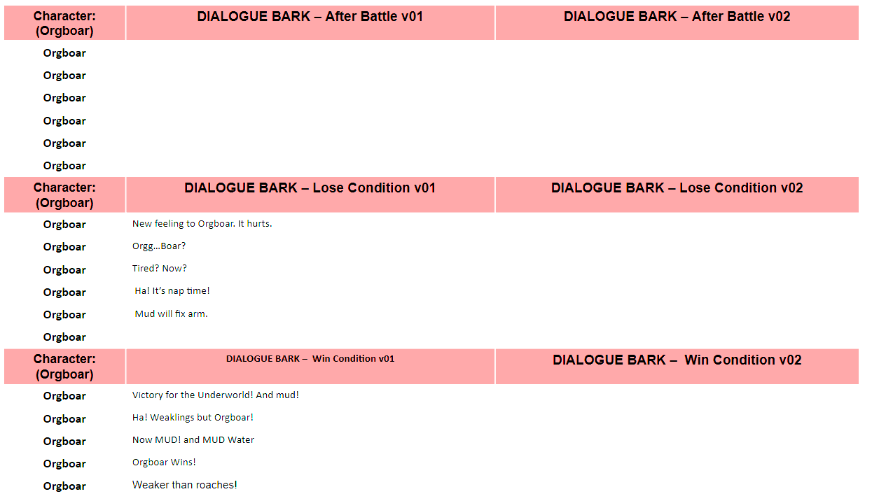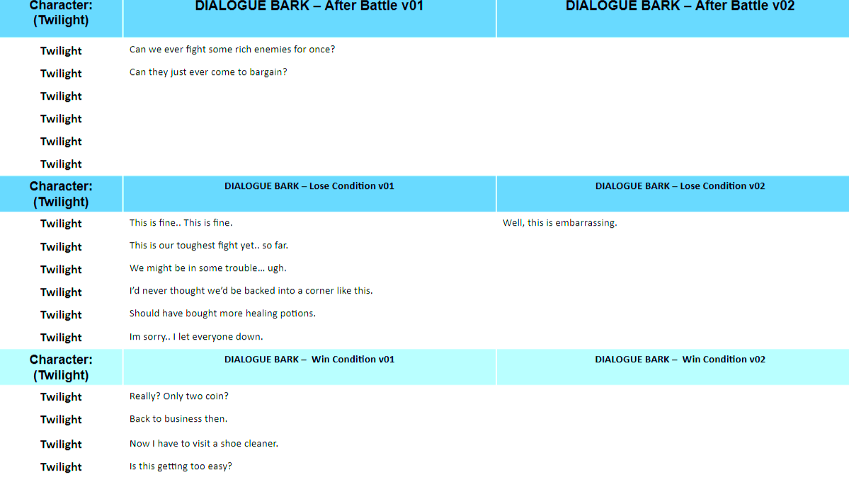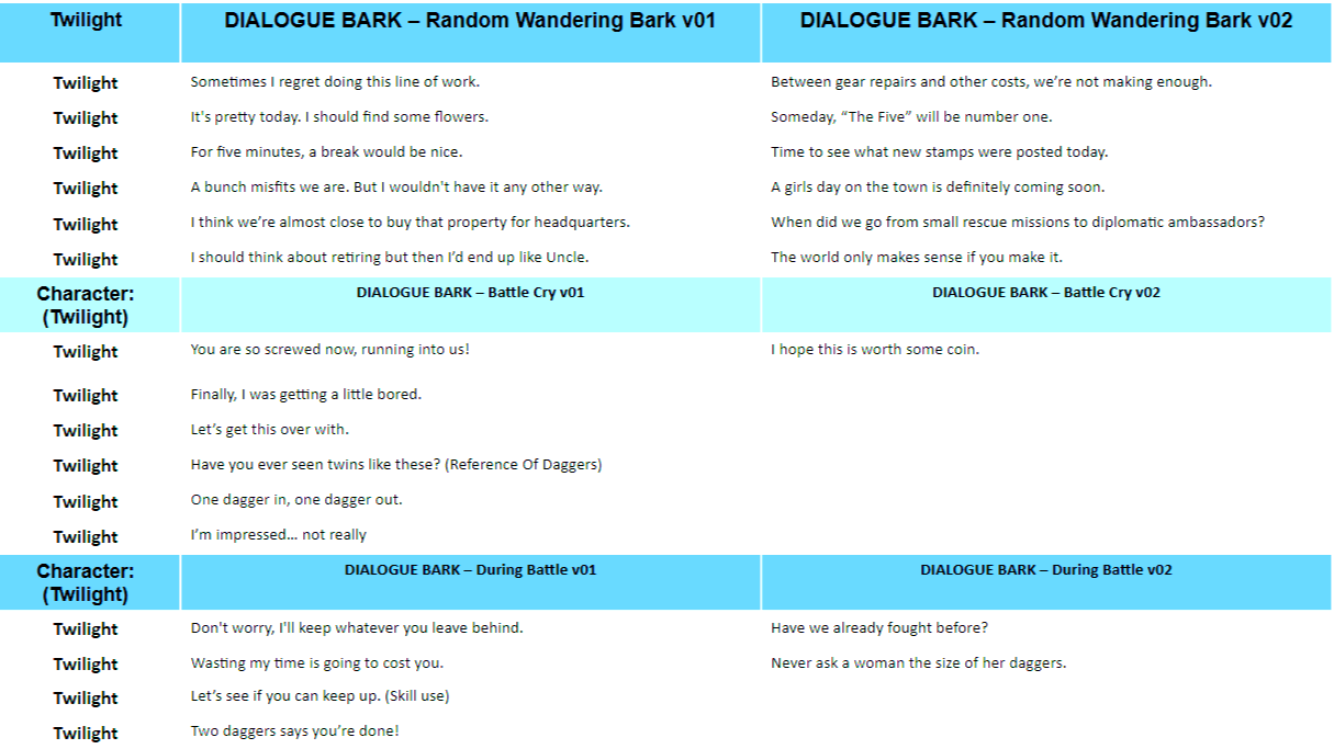 - Bios and Barks: developed dialogue for each character, keeping their design, combat function, and Jungian archetypes in mind.