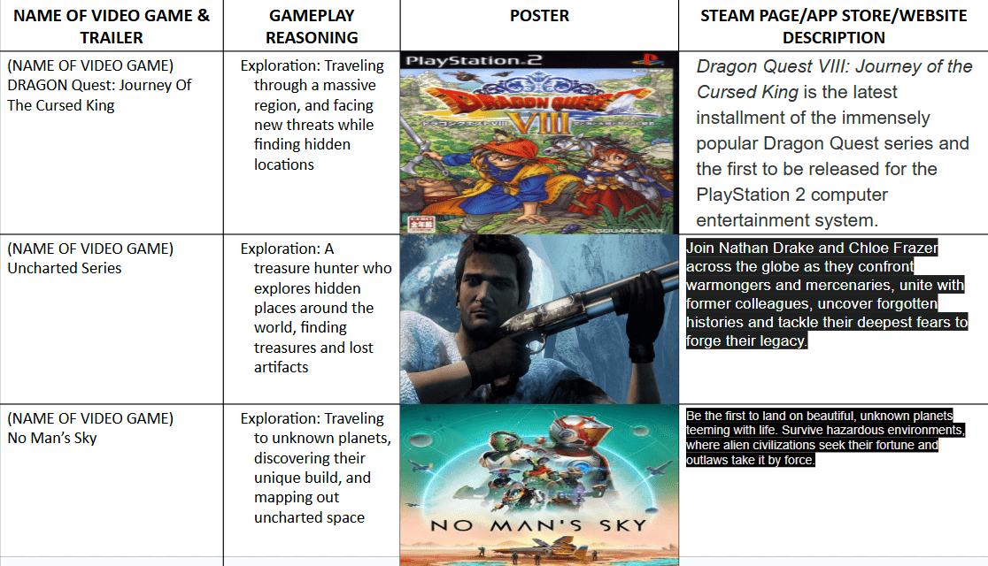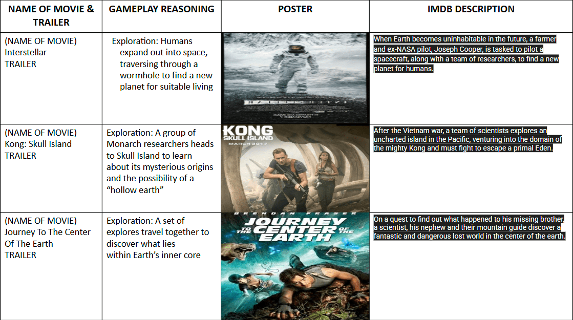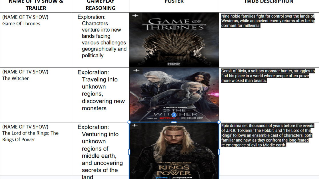 Analyzed games, movies, and shows with similar narrative themes.